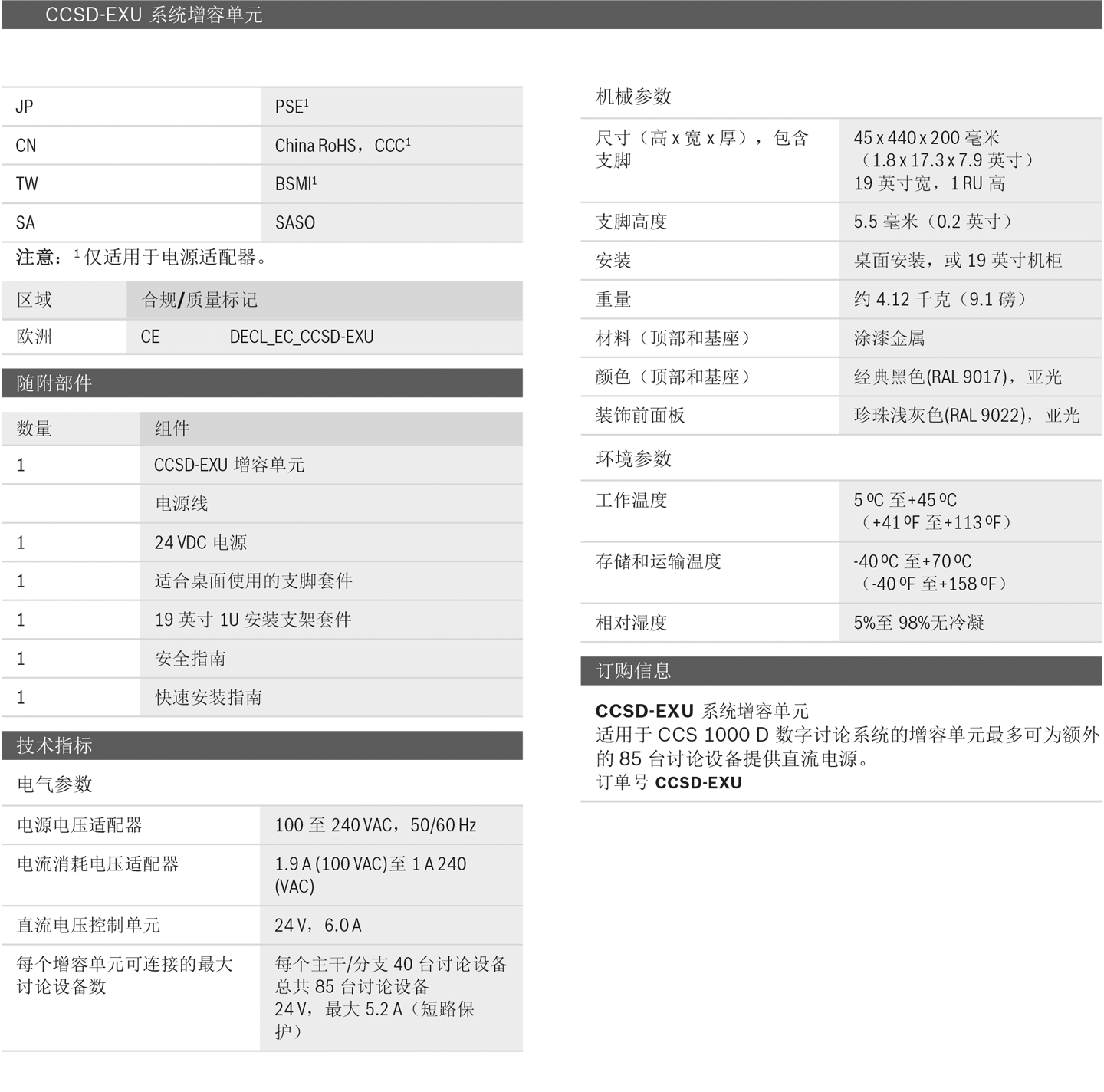 增容单元可与控制单元(CCSD‑CU 或CCSD‑CURD)配合使用,从而为CCS 1000 D 数字讨论系统提供额外的电源。一台或多台增容单元可用于扩展CCS 1000 D 数字讨论系统(增加多达245 台讨论设备)。1 台增容单元可为多达85台的额外讨论设备(CCSD‑DS 或CCSD‑DL)提供电源。